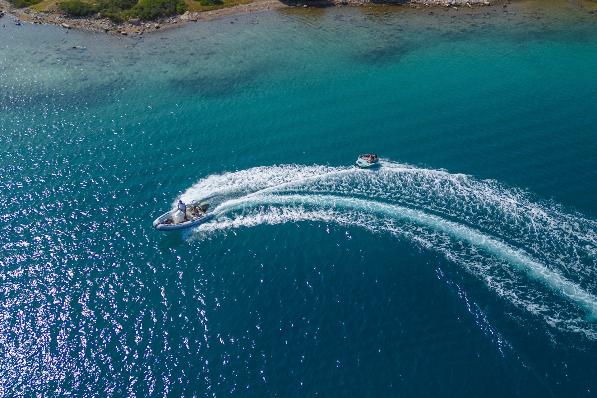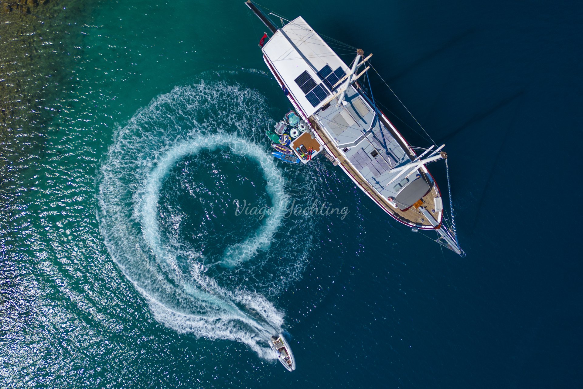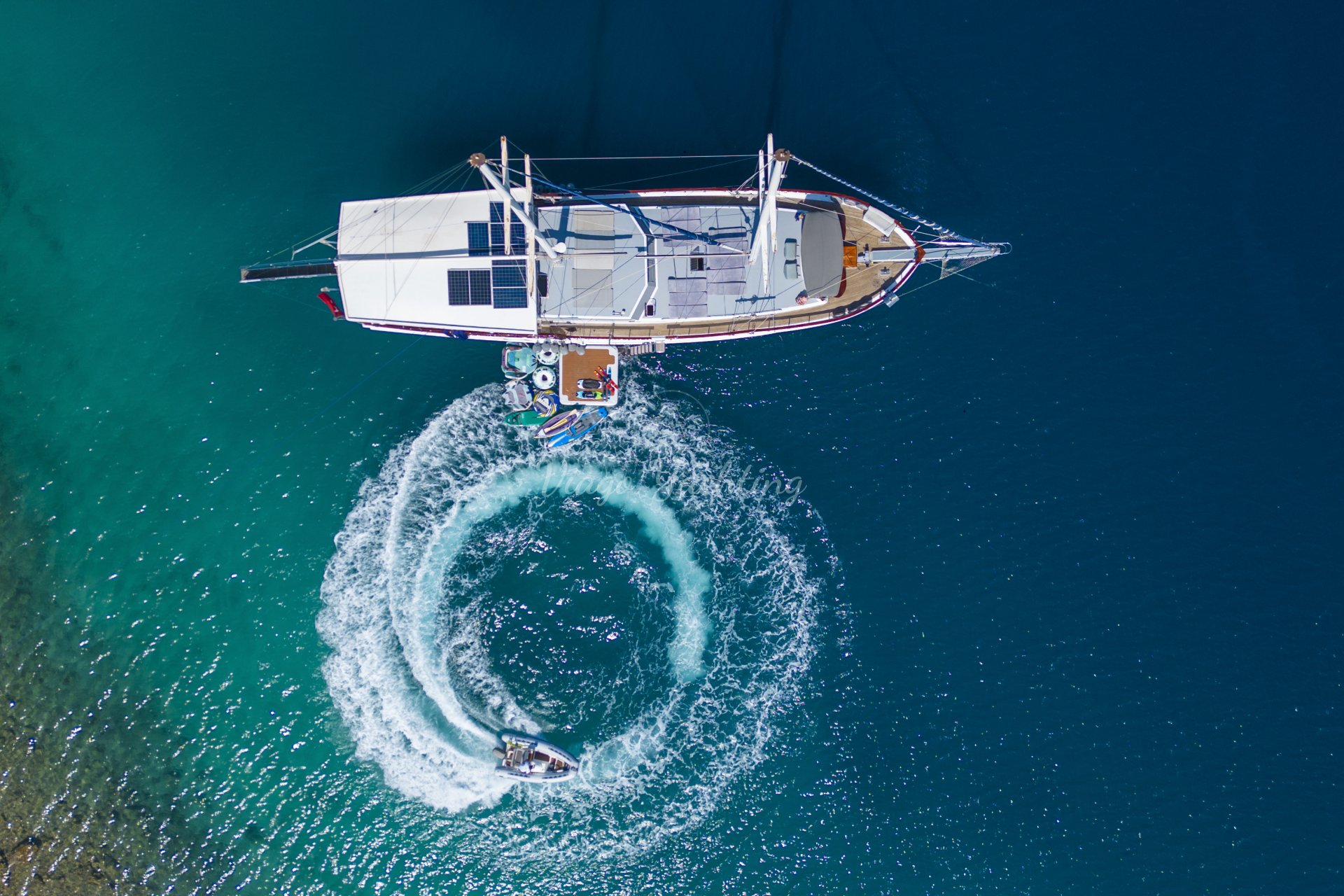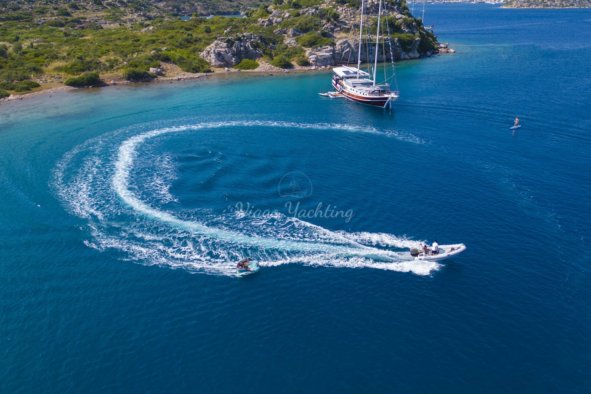 çekimine özen gösteren kişiler drone götürerek tekne gezisine unutulmaz bir